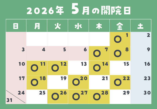 2026年5月の開院日カレンダーを掲載しました。4月から火曜日の診療も開始しています。